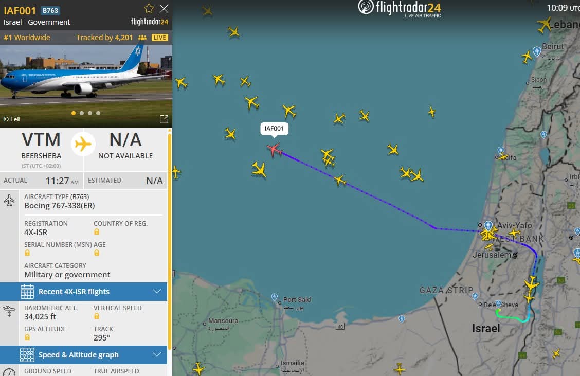 Το επίσημο αεροσκάφος του Ισραηλινού πρωθυπουργού Μπενιαμίν Νετανιάχου, γνωστό ως Φτερά της Σιών, απογειώθηκε πριν από λίγα λεπτά από το Ισραήλ προς άγνωστο προορισμό.