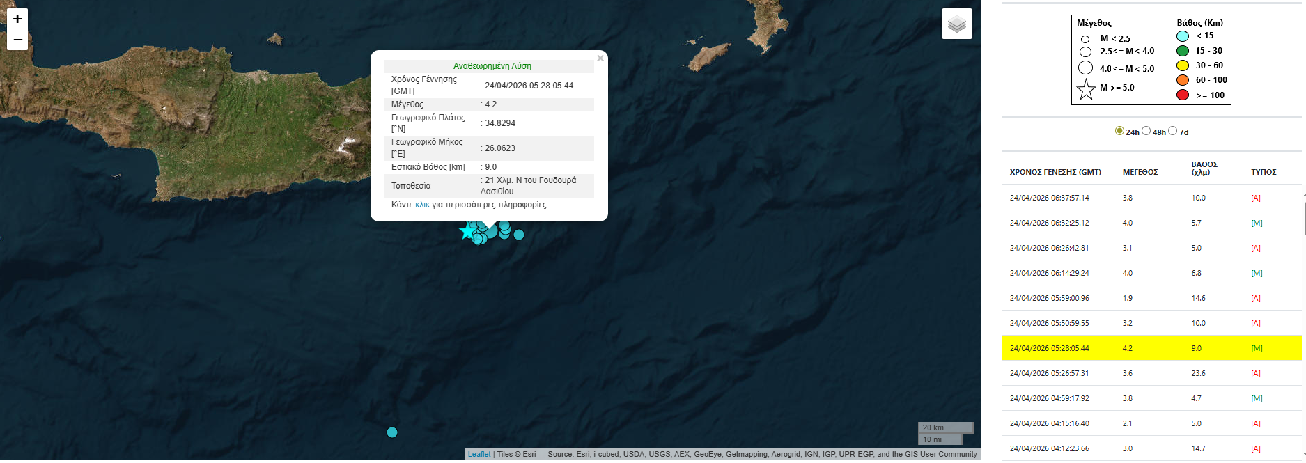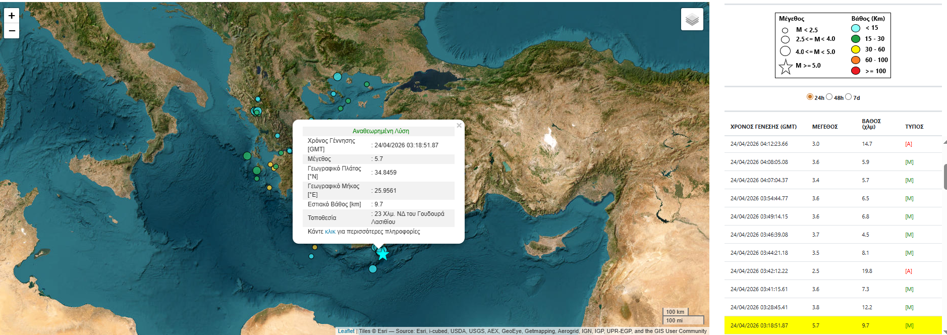 «ΙΣΧΥΡΗ ΣΕΙΣΜΙΚΗ ΔΟΝΗΣΗ ΝΑ ΚΡΗΤΗ 24/04/2026 06:18, M=5.5, EΠIK:405 XΛM. NNA AΘHNAΣ, 25 XΛM. NNΔ TOY ΓOYΔOYPA ΛAΣIΘIOY στο θαλάσσιο χώρο. Ο σεισμός έγινε αισθητός σε όλη την Κρήτη. Αναμενόμενο είναι μη σας ανησυχεί.