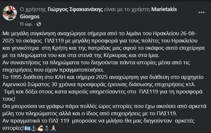 Το ευχαριστούμε για αυτά 30 χρόνια, το σκάφος ΠΛΣ119 με μεγάλη προσφορά για τους πολίτες του Ηρακλείου και γενικότερα στη Κρήτη και της πατρίδας μας αφού το σκάφος αυτό επιχείρησε με τα πληρώματα του και στα στενά της Κέρκυρας και στα Ιμια. Αν θα μπορούσε να μιλήσει θα μας έλεγε πόσες ιστορίες..