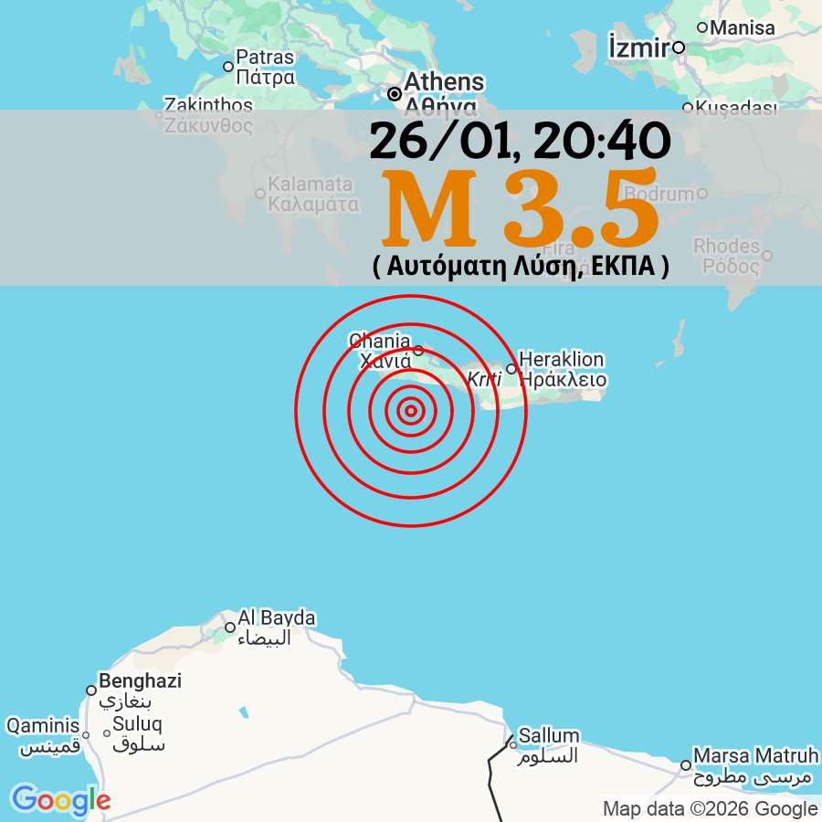 3️⃣5️⃣ 🟠 Σεισμός M 3.5, 26/01 20:40, βάθος 10 χλμ, 14 χλμ ΒΔ από Γαύδος.