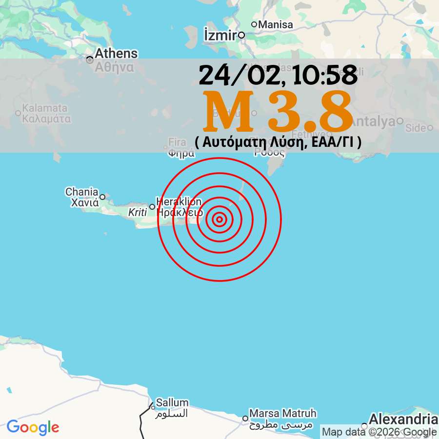 Ασθενής σεισμική δόνηση μεγέθους 3,8 βαθμών της κλίμακας Ρίχτερ καταγράφηκε το πρωί της 24ης Φεβρουαρίου στις 10:58, 52 χιλιόμετρα ανατολικά της Σητεία.