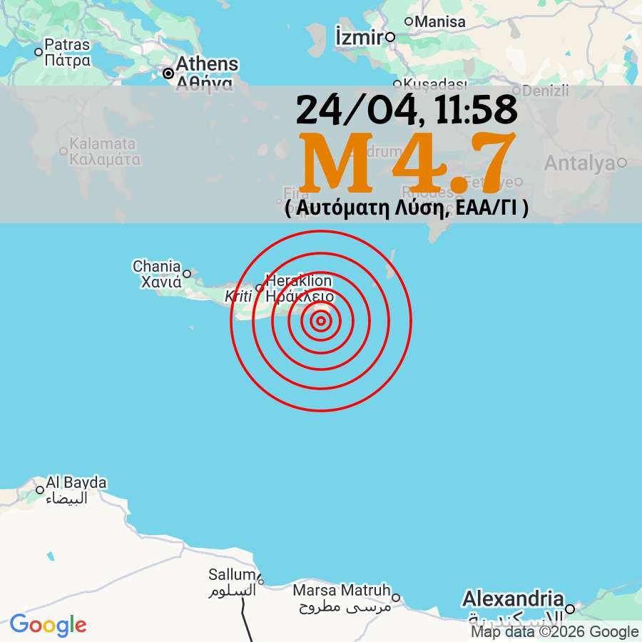 4️⃣7️⃣ 🟠 Σεισμός M 4.7, 24/04 11:58, βάθος 10 χλμ, 31 χλμ Ν από Σητεία.