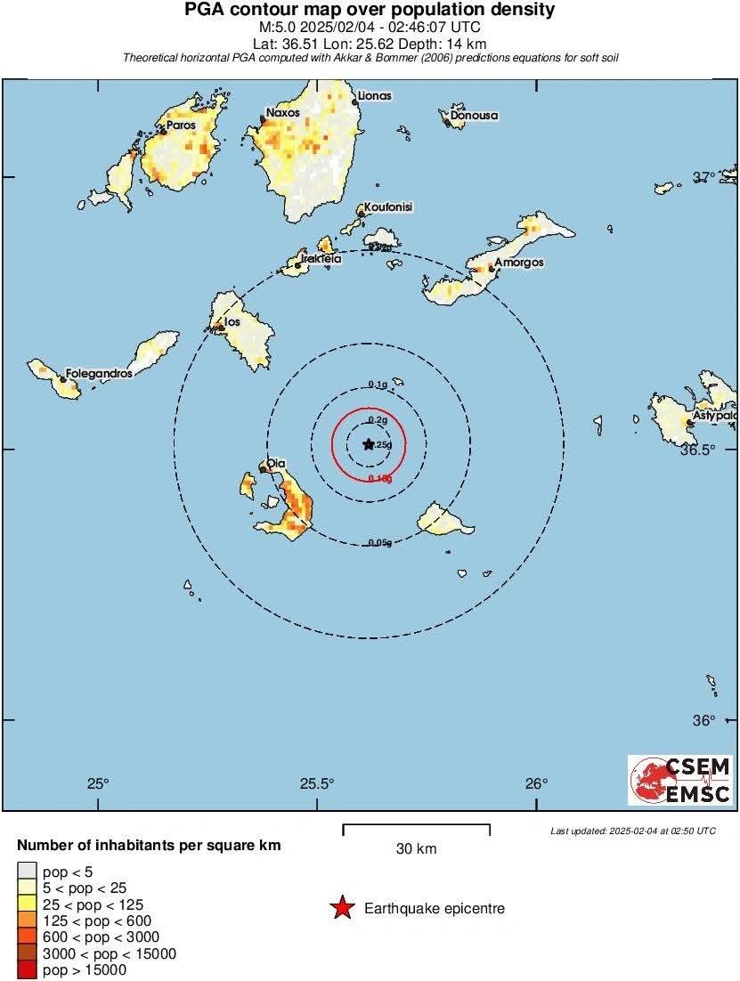 Κλειστά θα παραμείνουν τα σχολεία έως και την Παρασκευή 7/2/2025 σε Θήρα, Ανάφη, Ίο, και Αμοργό, όπως αποφασίστηκε από την κοινή συνεδρίαση των δύο Επιτροπών (της Μόνιμης Eπιστημονικής Eπιτροπής Εκτίμησης Σεισμικού Κινδύνου και Μείωσης της Σεισμικής Διακινδύνευσης και της Μόνιμης Επιστημονικής Επιτροπής Παρακολούθησης του Ελληνικού Ηφαιστειακού Τόξου του ΟΑΣΠ), λόγω της αυξημένης σεισμικής δραστηριότητας στη θαλάσσια περιοχή της Ανύδρου, μεταξύ Θήρας και Αμοργού.