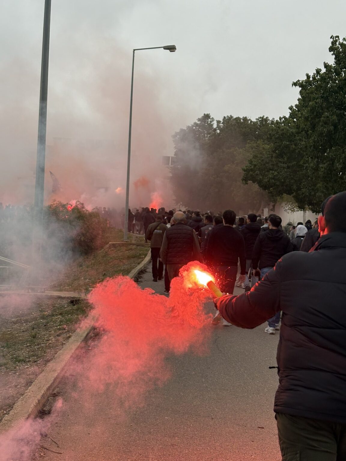 Με συνθήματα και καπνογόνα, αποθέωσαν τους ποδοσφαιριστές αλλά και τον προπονητή Χρήστος Κόντης, καλώντας τους να μπουν στο γήπεδο αποφασισμένοι και να παλέψουν μέχρι τέλους για την κατάκτηση του Κυπέλλου Ελλάδας.