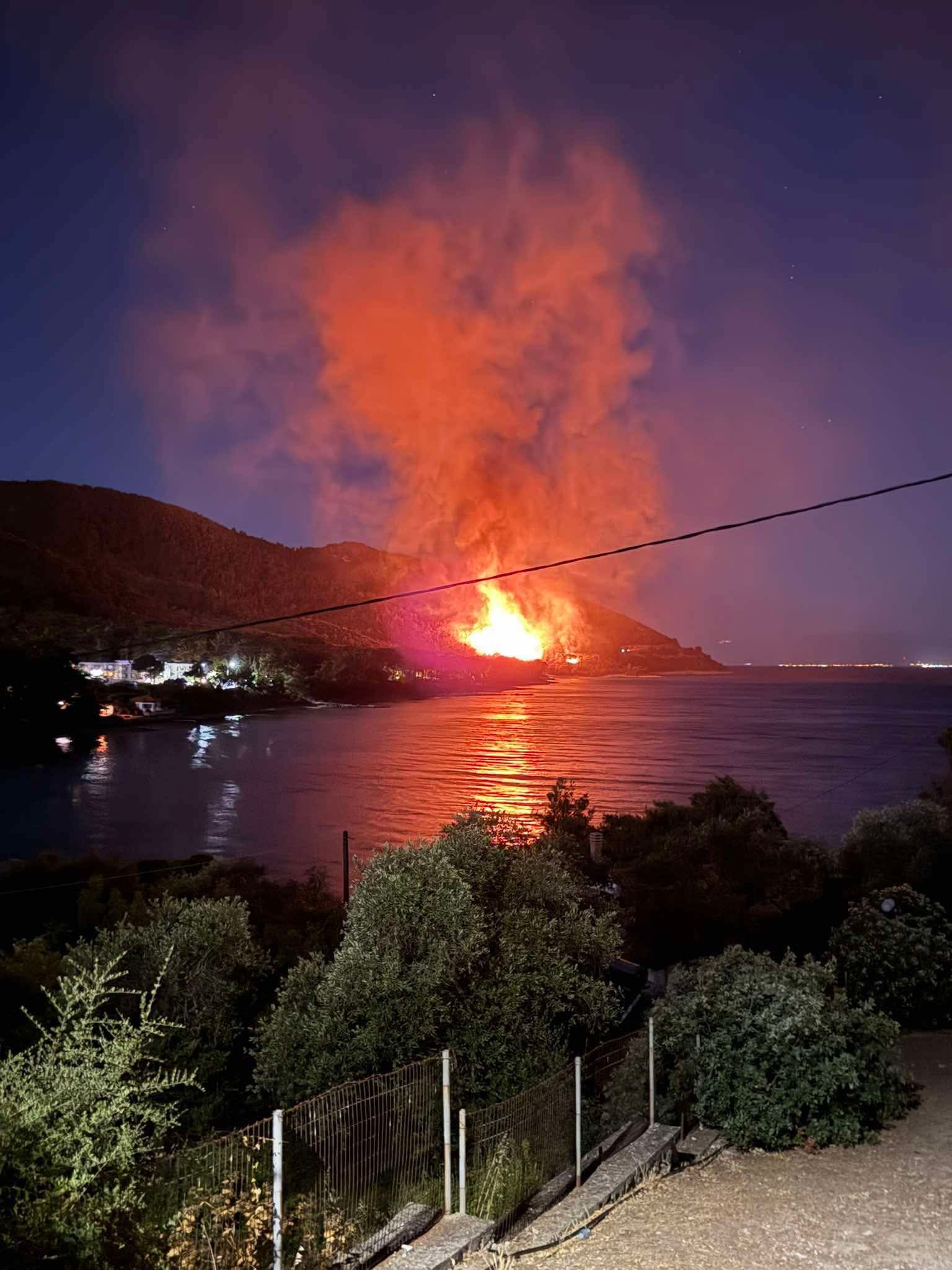 Μπλάκ άουτ στο νησί της Θάσου λόγω της πυρκαγιάς. Η πυρκαγιά καίει σε πευκόφυτη πλαγιά κοντά στην θάλασσα.